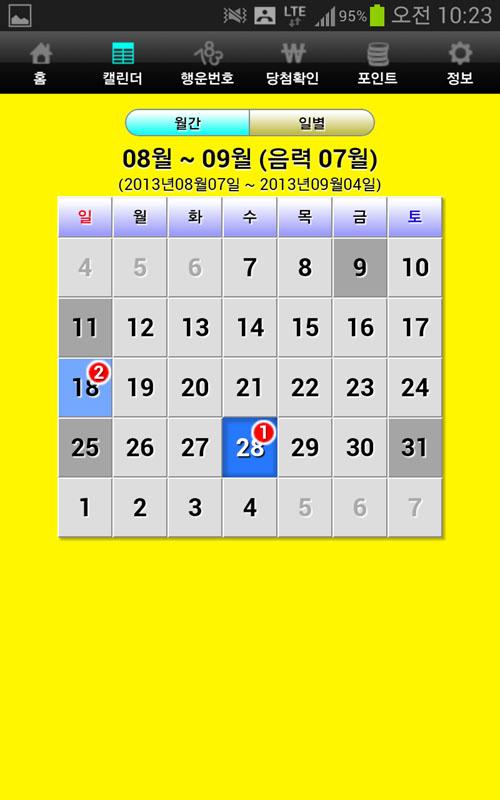 로또 운세는 캘린터(달력) 형태와 함께, "이달 중 오늘"의 로또운 순위와 종류(로또하기 좋은 날, 보통인 날, 나쁜 날), 또는 "1년 중 베스트"인 로또월운의 순위와 종류, 로또하기 좋은 날의 일자와 좋은 시간을 알려줍니다.