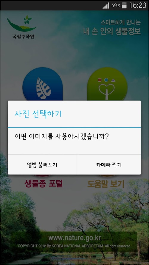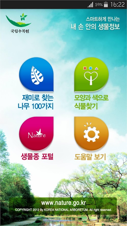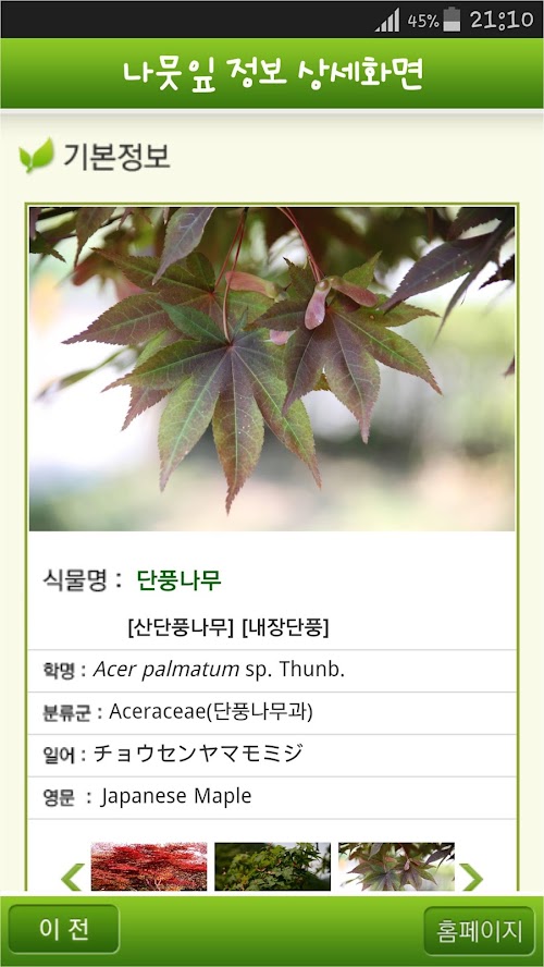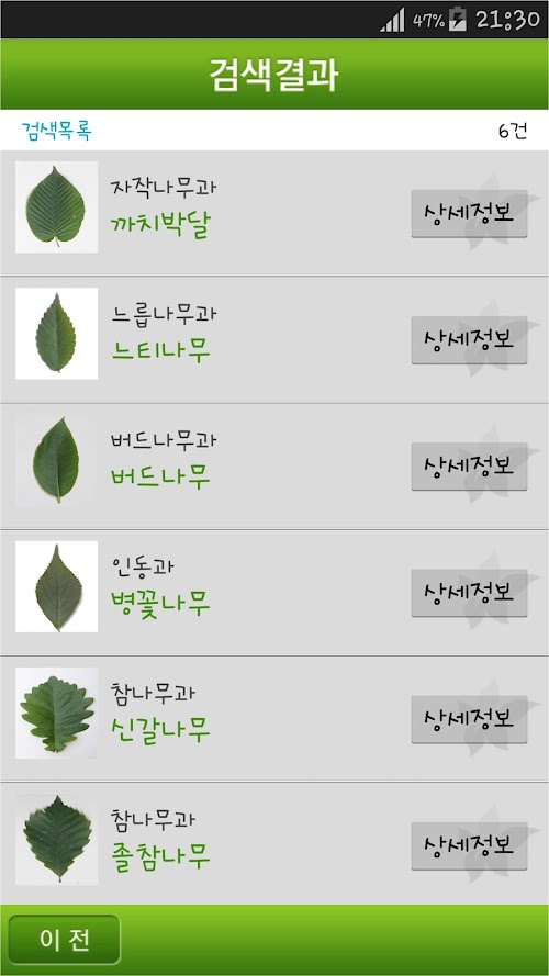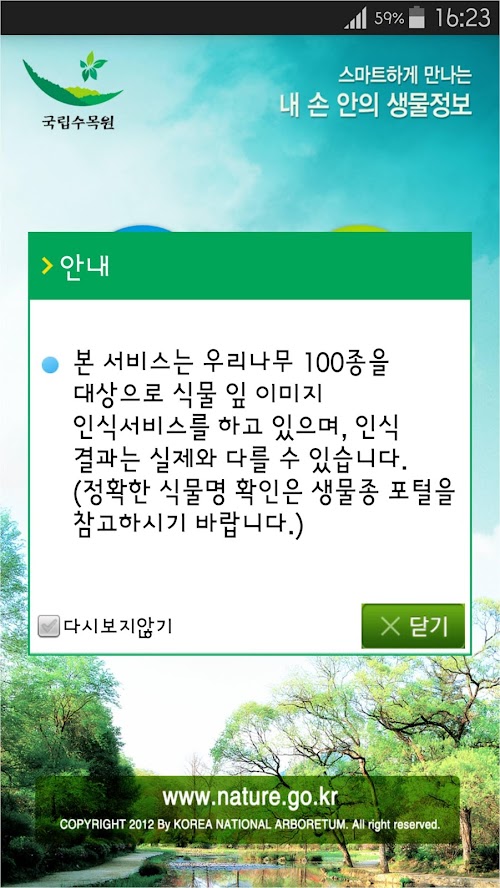 해당 앱은 산림청 국립수목원에서 발간한 「우리 산에서 만나는 나무와 풀 中-우리나무 100가지」를 대상으로 서비스하며, 그 이외의 수종은 검색되지 않습니다.