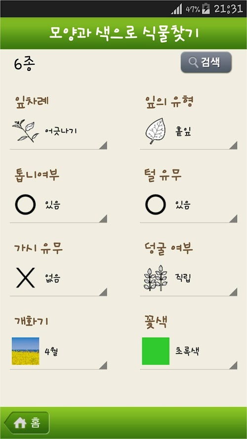 - 모양과 색 등 특징을 선택하여 식물을 검색 할 수 있습니다.