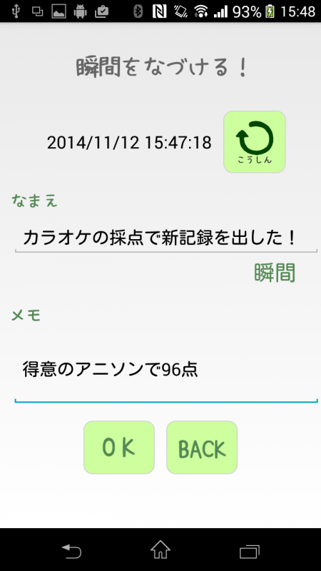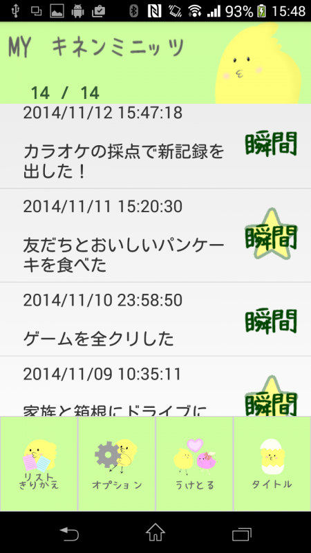 このアプリは記念の「瞬間」を記録し、名前をつけることで自分だけの記念「瞬間」を作って楽しむアプリになります。また、「瞬間」の登録最大件数は1000件、お気に入り最大件数は100件までとなっています。