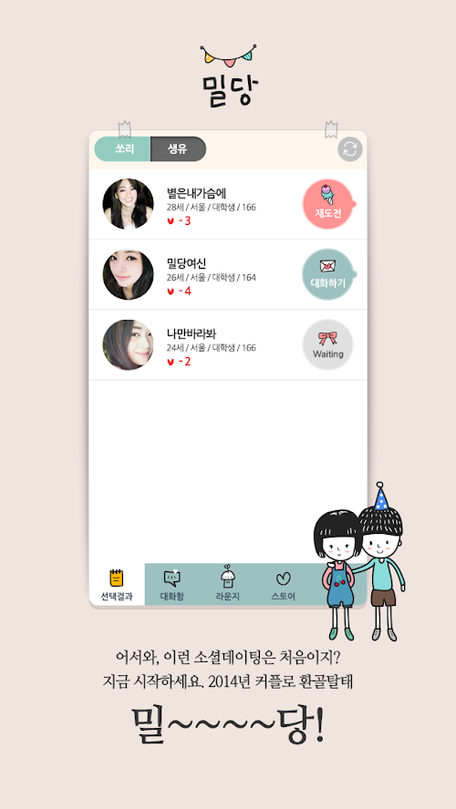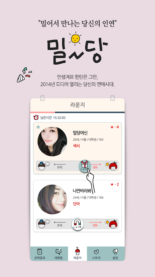 8.마음에 드는 이성이 없다면? 혹은 상대와의 매칭에 실패했다면. 새로운 이성보기로 언제든 새로운 밀당을 시작할 수 있어요.