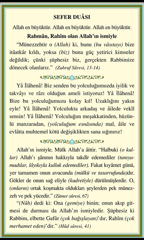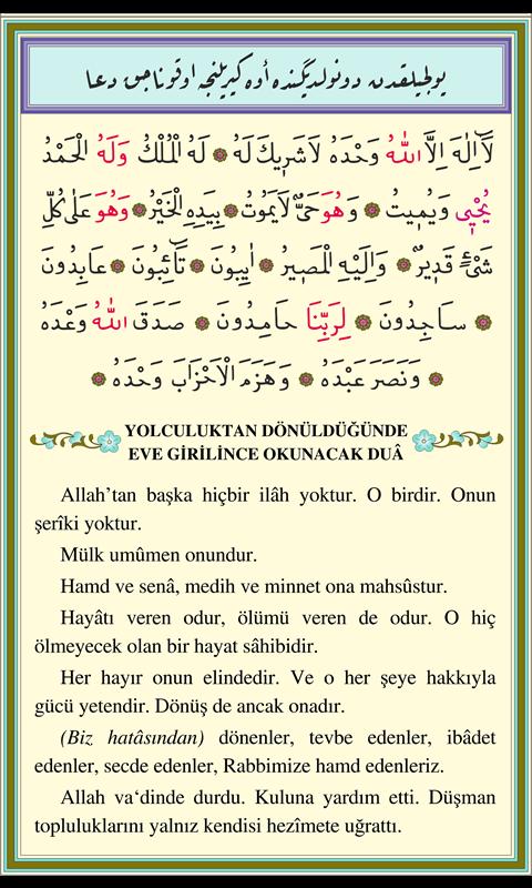 Yola çıkarken ve yolculuktan dönüldüğünde eve girilince okunacak dualar ve mealleri.