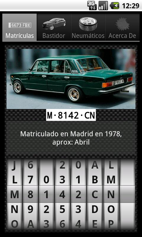 - A high resolution photo of a car of the era of the requested registration is displayed. NO corresponds to the real car, until the function to save favorites, where you can take a picture and save it with tuition is implemented.