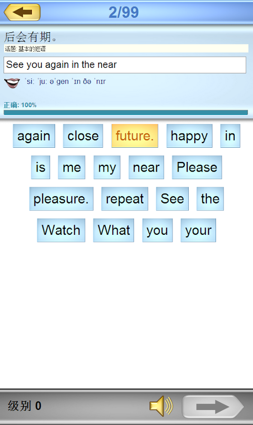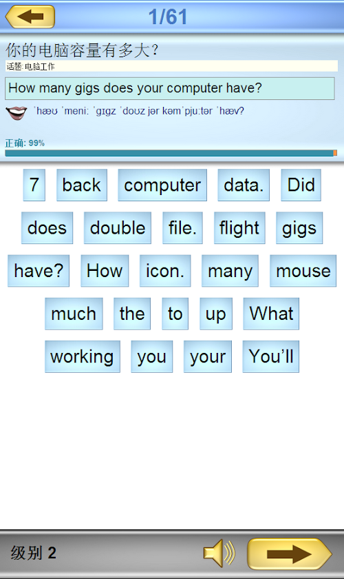The course is divided in three different levels of difficulty, the last level students will spell out a complete sentence in accordance with the Chinese to hear the recording, which not only exercise the student's spelling ability, but also improve the students' speaking ability.