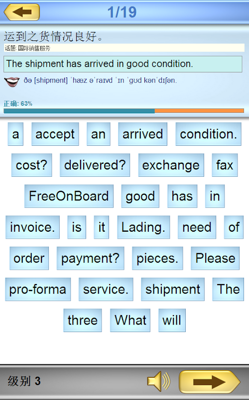 The course is divided in three different levels of difficulty, the last level students will spell out a complete sentence in accordance with the Chinese to hear the recording, which not only exercise the student's spelling ability, but also improve the students' speaking ability.