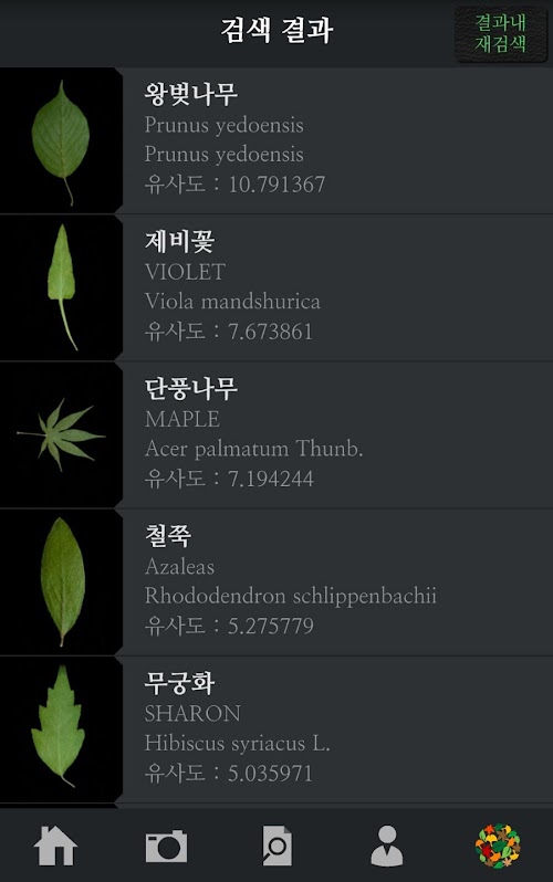 PlantIDS가 유사도가 높은 1위에서 10위의 식물을 보여 줍니다.
