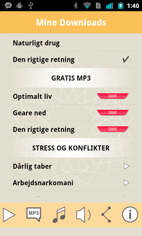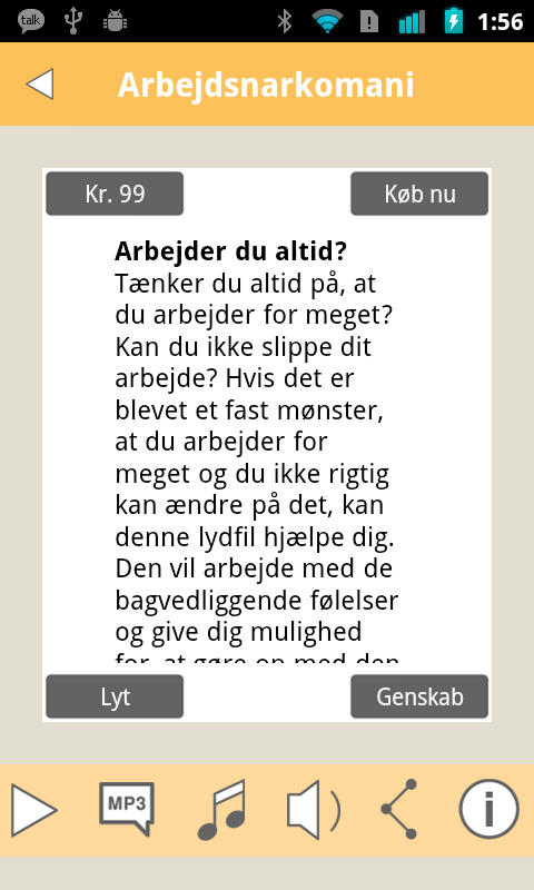 Der følger en gratis hypnose "Den rigtige retning" med din download. Du kan senere tilkøbe andre selvhypnoser direkte fra programmet. Priserne for disse er kr. 99,-