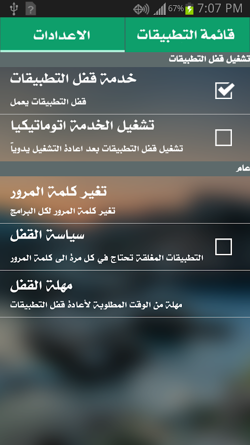تطبيق قفل التطبيقات اول تطبيق عربي لقفل التطبيقات والواتس اب على هاتفك الذكي بكلمة مرور لكي تحافظ على خصوصيتك, يمكنك من خلال هذا البرنامج قفل جميع التطبيقات التى لديك على الهاتف او بعض منها بضغطة زر واحدة, وقد اعتمدنا على البساطة في تصميم هذا البرنامج حتى تتمكن من تشغيلة والتعامل معة بكل سهولة ويسر على غرار البرامج الاجنبية الصعبة.Application applications lock first Arab application to lock applications and Alwats August on your smartphone with a password to keep your privacy, you can through this program all applications that lock you have on the phone or some of them push of a button, has relied on the simplicity of the design of this program so that it can batch and deal with him with ease along the lines of the difficult foreign programs.