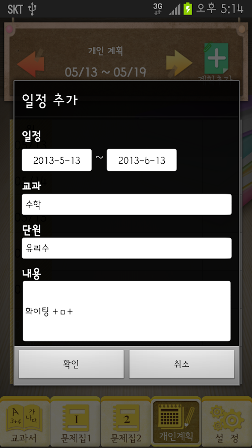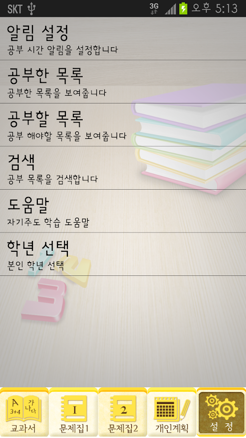 Workbooks: Textbook Click the Add button to add your workbooks. Contents of the main subjects of study guide shows. Table of Contents Click on the one day of the date of the study appears. Studied through the date displayed in the table of contents one can distinguish between those that have not studied.