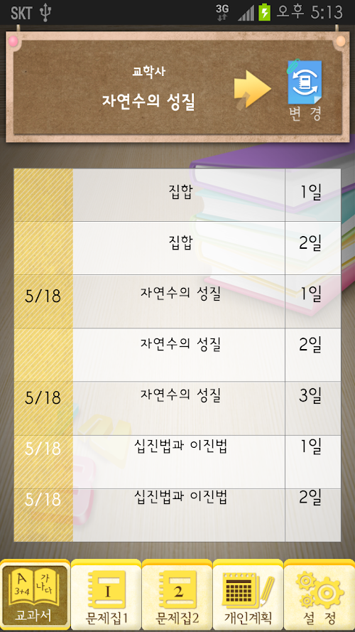 Textbooks: Textbook press materials, please choose the Add button. Major textbook shows the Table of Contents. Table of Contents Click on the one day of the date of the study appears. Studied through the date displayed in the table of contents one can distinguish between those that have not studied.