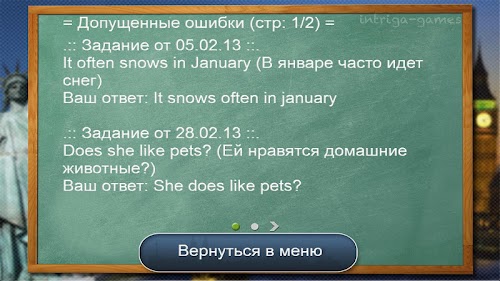 ✔ Ведение журнала ошибок. Программа запоминает совершённые ошибки в соответствии с определёнными временами английского языка. При необходимости можно посмотреть когда и какие ошибки Вы совершили.IntrigaEnglishTeacher - an automated system of teaching English on drawing up proposals.