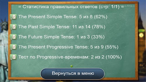 ✔ 5 типов смешанных тестов (тест только по настоящим временам, по прошедшим, по будущим, по Simple'ам, по Progressive'ам)