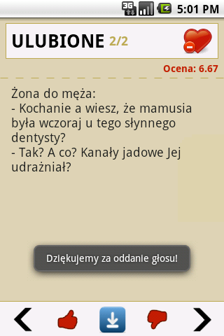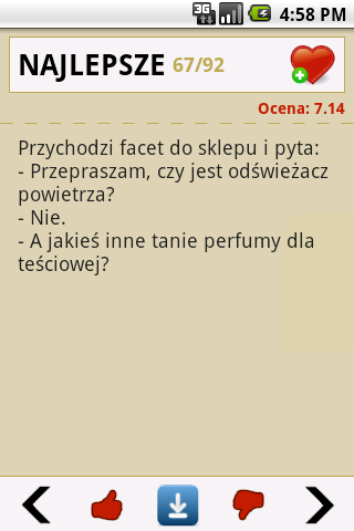 Kawały o teściowej możesz przeglądać na kilka różnych sposobów: nowe, najlepsze, losowe, ulubione. W kategorii najlepsze, kawały są posortowane względem oceny wystawionej przez użytkowników. Sam również możesz wpływać na pozycję kawału w rankingu oceniając dowcip "na plus" bądź "na minus". Oceny aktualizowane są raz w tygodniu podczas aktualizacji aplikacji. Możesz również stworzyć własną listę ulubionych kawałów o teściowej, wystarczy że klikniesz ikonę "serca z plusem" aby dodać kawał lub "serca z minusem" aby usunąć kawał z ulubionych.