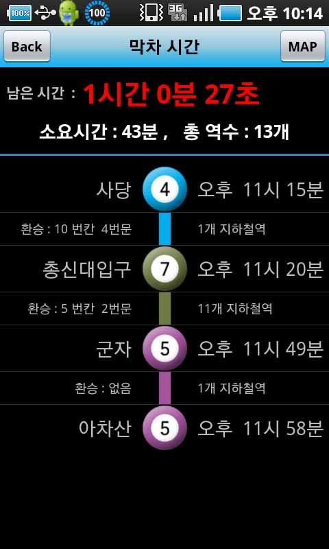 마지막으로 출발역에서 언제 타야 도착역의 마지막 지하철을 탈 수 있는지 남은 시간을 초단위로 보여줍니다.