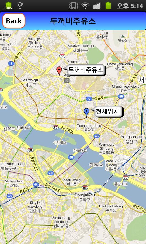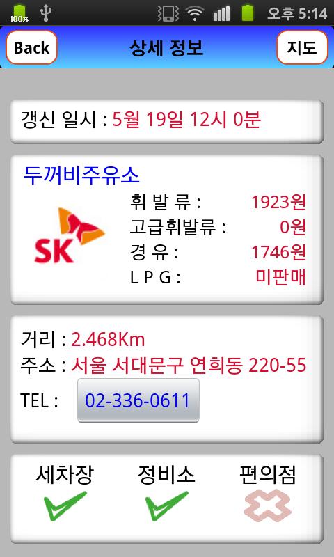 Go. The detail page update date, oil prices, street address, telephone number (Press outgoing), provides information on facilities. Press the Map button to provide guidance information and shows the current position with the gas station location. If you search by address, current location will appear.