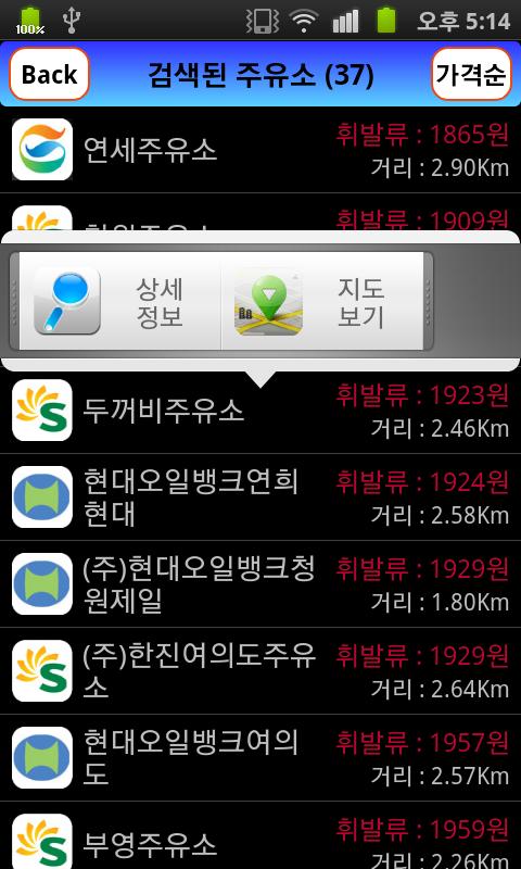 거리순, 가격순으로 검색된 주유소들을 보여줍니다.