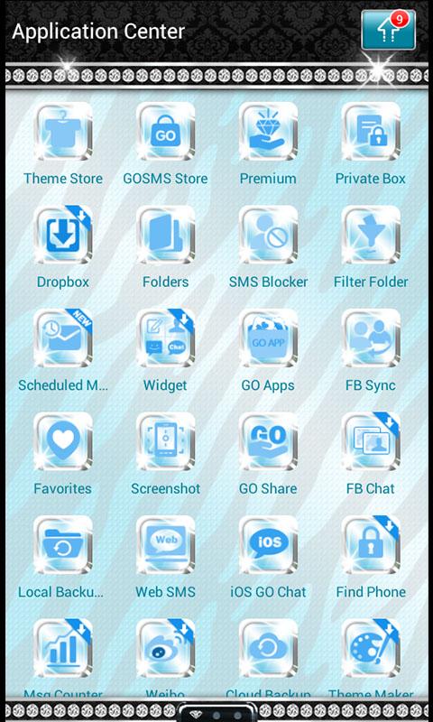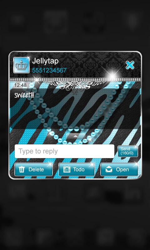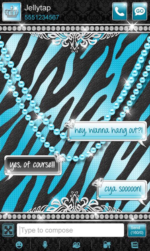 Live it up with this ultra luxurious teal and black theme for Go SMS Pro! Zebra print doesn't get much more luxurious than this! Soak it all in, notice the intricate platinum metalwork, two strands of pearls draped across the screen, damask patterns, and diamonds inlaid throughout! Check it out!