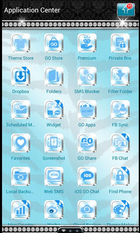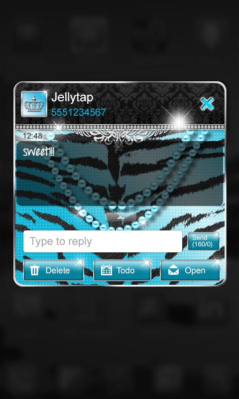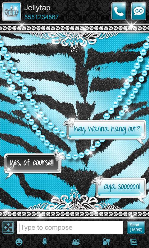 Live it up with this ultra luxurious teal and black theme for Go SMS Pro! Tiger print doesn't get much more luxurious than this! Soak it all in, notice the intricate platinum metalwork, two strands of pearls draped across the screen, damask patterns, and diamonds inlaid throughout! Check it out!