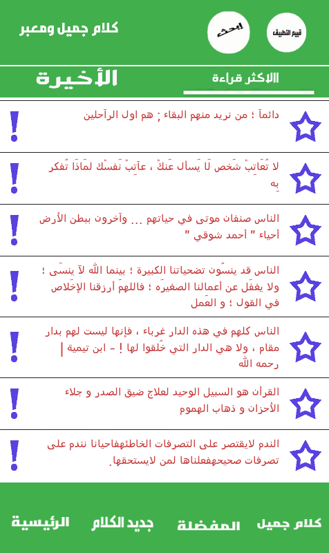 كما ان التطبيق سهل وبألوان بسيطة لسهولة القراءة , ويسمح لكم اخد الكلام منه واستعماله في حساباتكم وبين اصدقائكم.