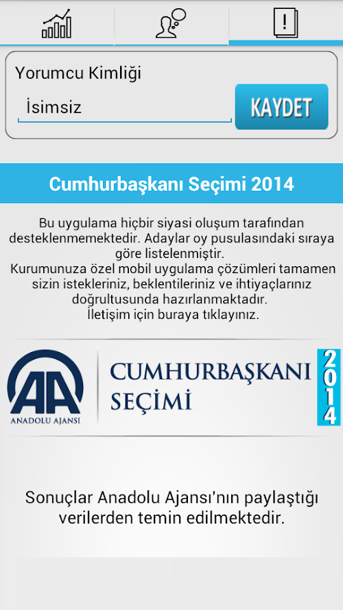 Bilgi ve görüşlerinizi mail ile iletebilirsiniz.Presidential Election in the Republic of Turkey on August 10, you can follow the results in real-time commentators will also determine your identity and make comments or reviews that other users have made can follow.