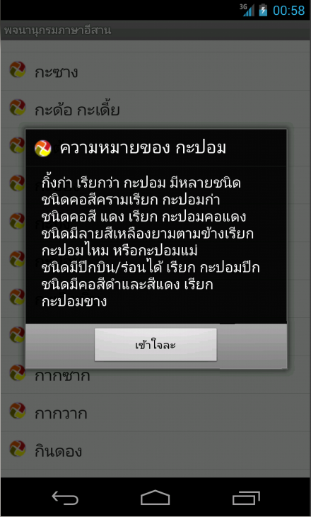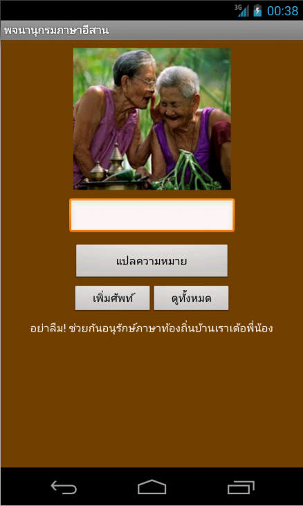 ##### ทางผู้จัดทำหวังเป็นอย่างยิ่งว่า แอพนี้จะช่วยอนุรักษ์คำศัพท์ภาษาท้องถิ่นภาคอีสานของเราให้คงอยู่สืบไป# # # # # Dictionary application thread. Collect vocabulary localized Northeast. The vocabulary has been introduced from other apps, and websites isangate.com consists of words and some words are meaningful sentence with implementation. This application is available both online and offline.