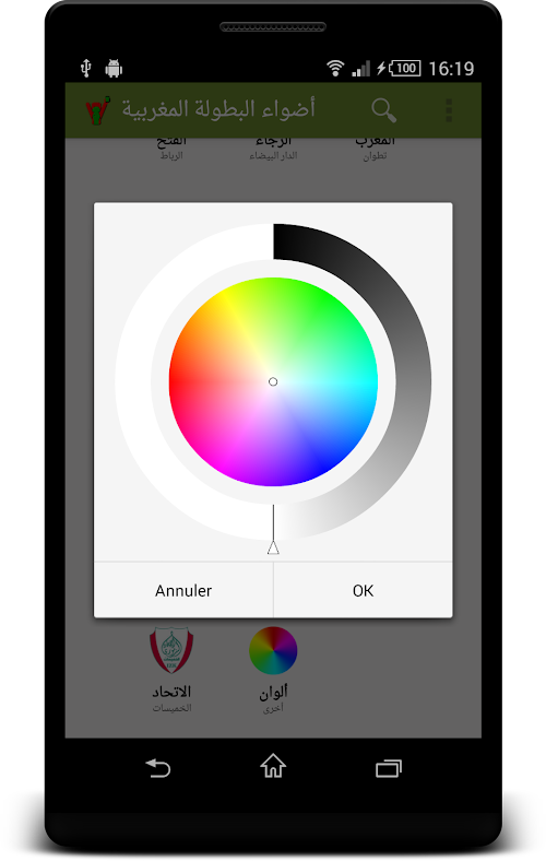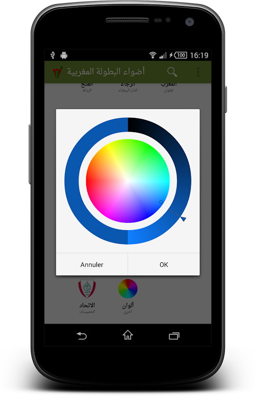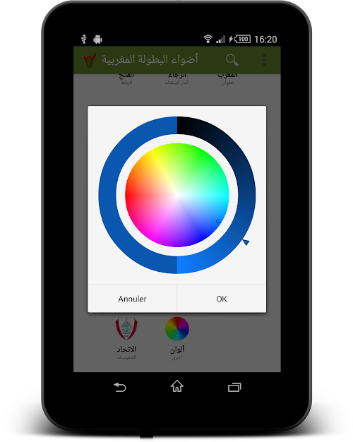 يمكن اختيار لون آخر عن طريق الضغط على ألوان أخرى أسف لائحة الفرق المغربية لتظهر لك نافدة بها جميع الألوان اختر أيا منها واضغط على ok للتحول الشاشة الى اللون المختار.