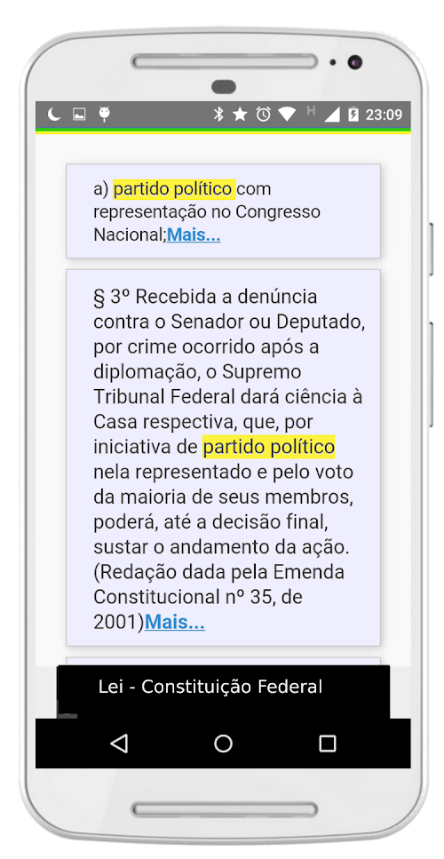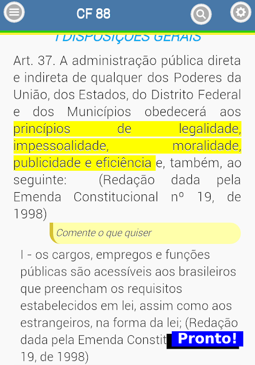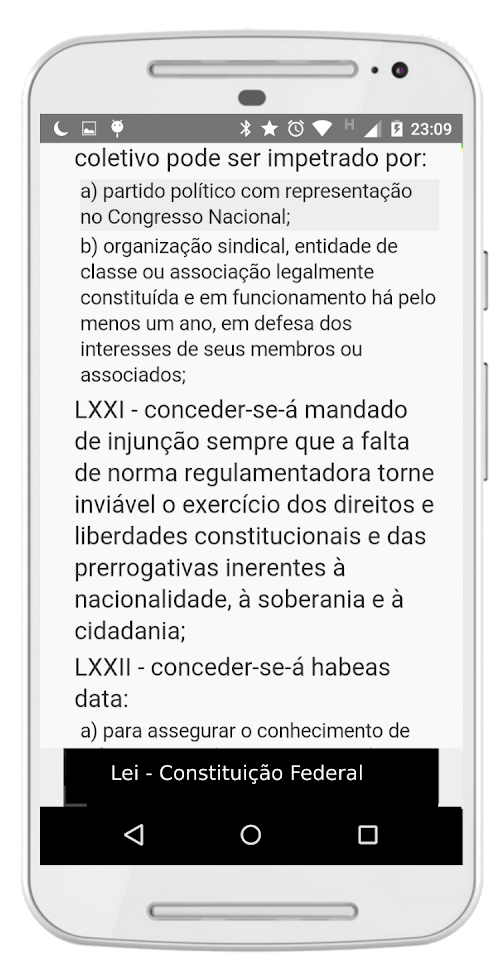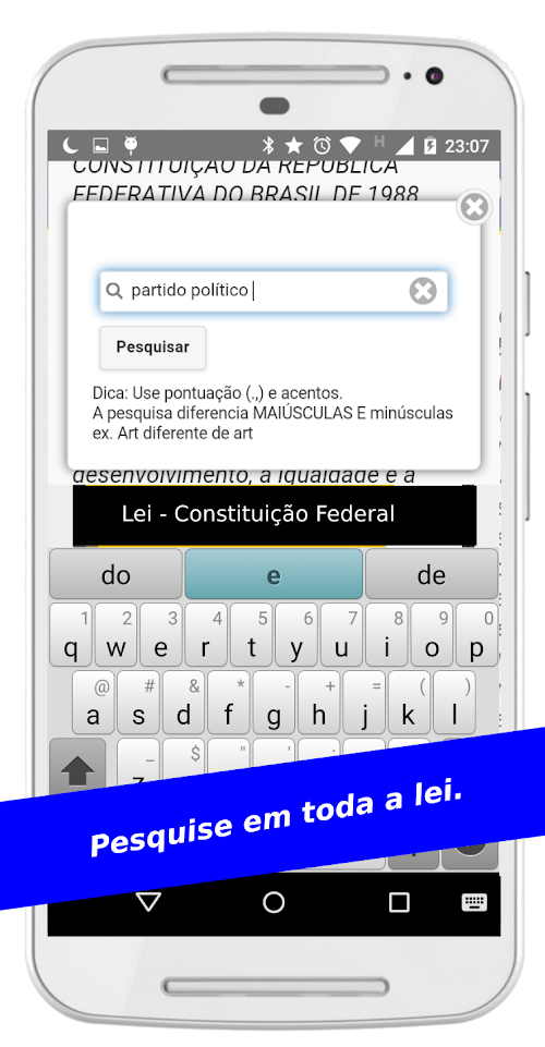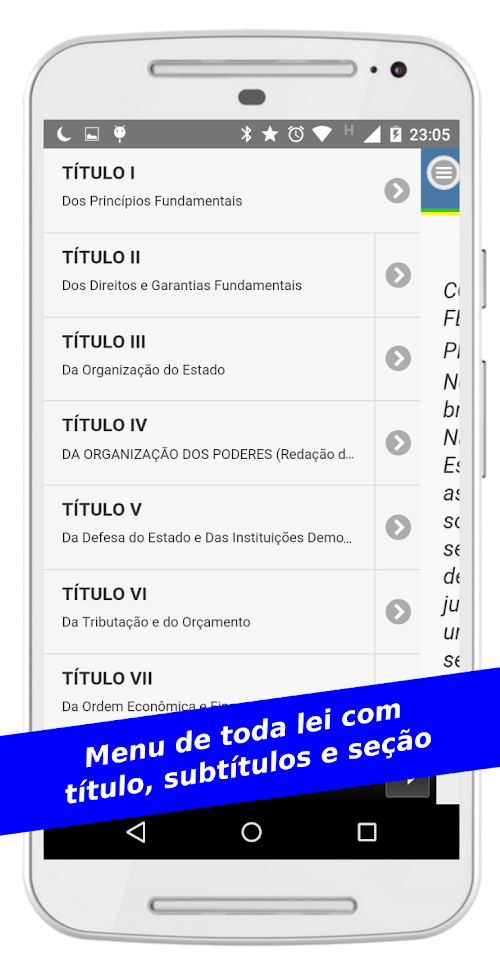 Envie suas sugestões ou relato de bugs pelo Play Store ou pelo email: [email protected] the Constitution, the highest law of Brazil, on your smartphone or tablet. Read federal law optimally for your device. The app also has menu titles, chapters and sections, so you can find the part you need without difficulties, all offline. Ideal for those studying for civil service and bar exams.