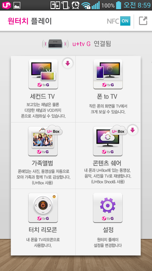 원터치 플레이는 U+tv G 서비스 가입 고객들께 셋탑과 함께 제공되는 NFC Tag와 보유하고 계시는 스마트폰의 NFC Tag를 서로 터치하여 손쉽게 모바일 연동서비스를 즐기실 수 있도록 제공되는 어플입니다.