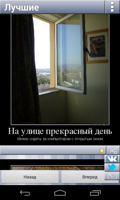 - Делиться демотиваторами в социальных сетях Twitter и VKontakte, а также отправка по Email