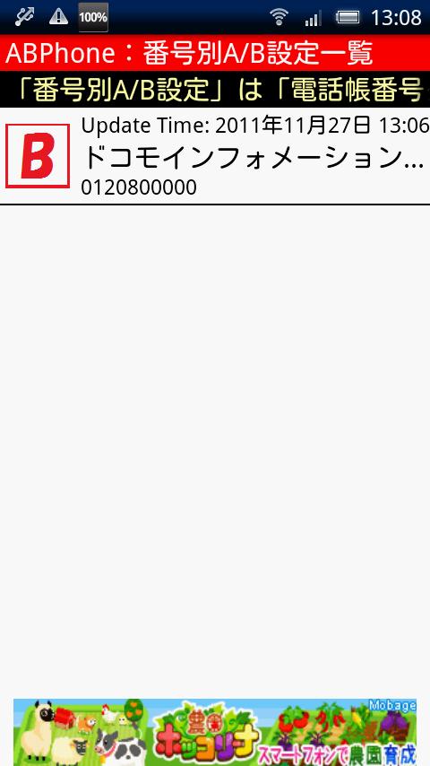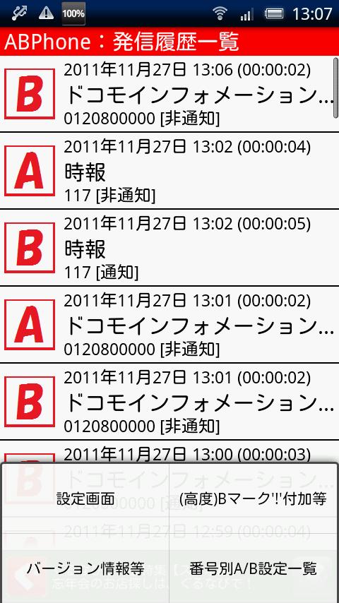 ・2011年冬以降発売の一部機種において、標準電話アプリがGoogle標準の履歴機能を使用せず独自データベースで管理しているため、ABPhoneからその履歴全てに直接アクセスできません。可能な限り対応しましたが、標準搭載の履歴でB番号発信履歴に一部ゴミが残る場合がありますので、発信履歴確認時は、ABPhone標準の発信履歴画面をご活用下さい。