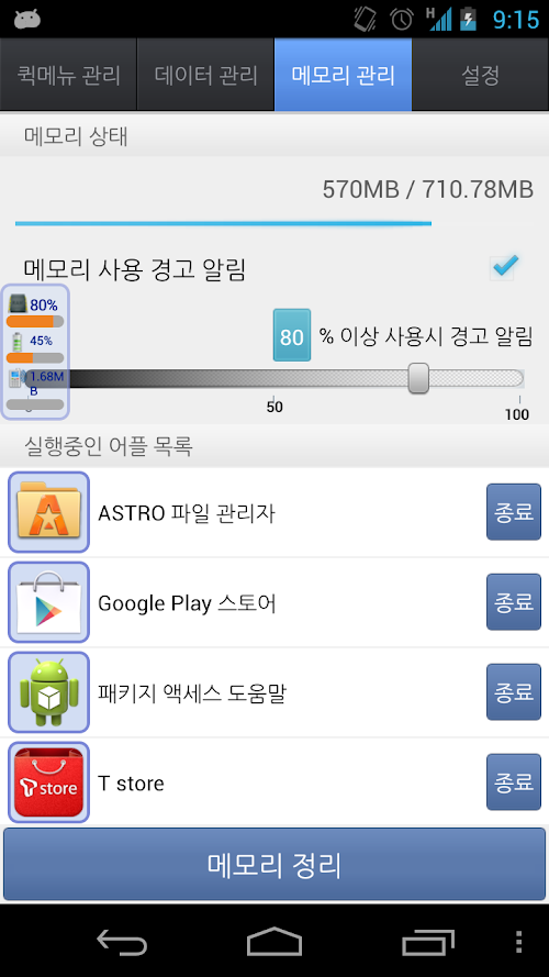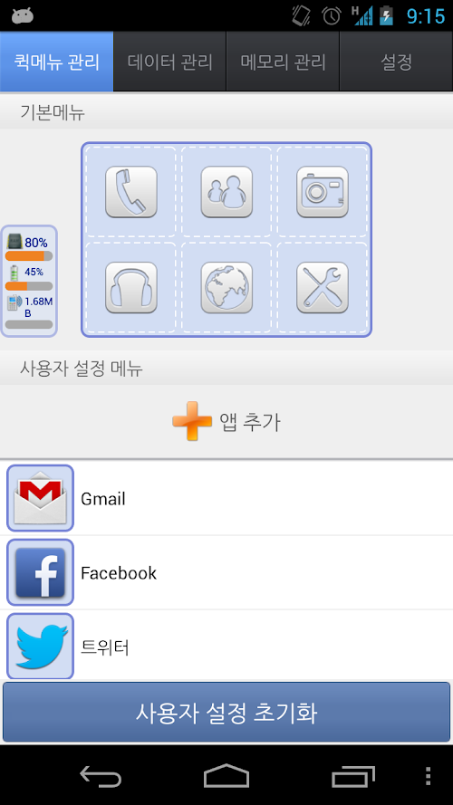 어플 사용중 문제가 발생하거나 개선 사항이 있으실 경우 내용과 함께 사용하시는 폰 모델명 등을 메일([email protected])으로 보내주시면 개선에 큰 도움이 됩니다. 감사합니다.Quick Touch running any app can be moved even if the time is always shown on top. I want to run as fast as you can run the app and register at any time, always check data usage and memory, and the battery can be Depending on the status of data usage and memory available notification to the user to maintain optimal use of the phone to help.