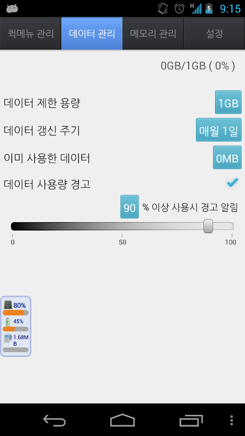 (NotificationBar 컨트롤 모드는 android 4.0 이상의 버전에서만 지원.. 이하버전에서는 메모리, 배터리, 모바일 데이터 모니터링만 가능)