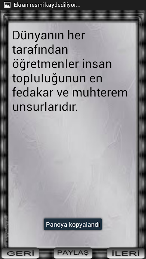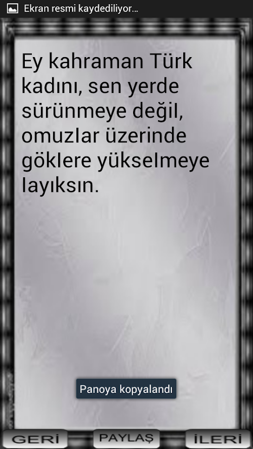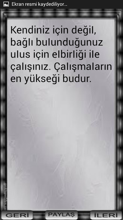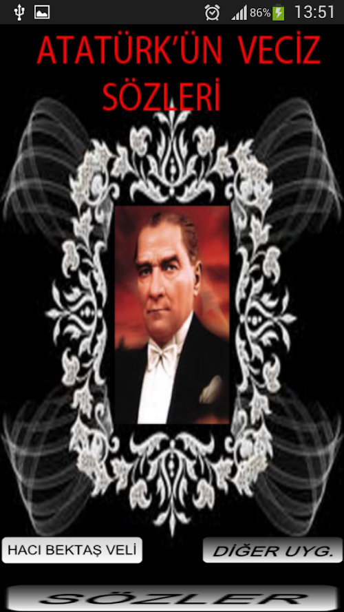 Atatürk’ü anlamak onun benimsediği düşünceleri uygulamakla olur. Türkiye Cumhuriyeti Devleti’nin kuruluşu yeni bir devre geçişin imzasıdır. Ülkenin her karışı yabancılar tarafından kuşatılmış iken özgürlüğüne düşkün Türk milletine liderlik yapan Atatürk, milletimizin tutsak yaşayamacağını bilerek öncülük yapıp ülkemizi mucize bir şekilde bağımsızlığına kavuşturmuştur.Uygulamamızla birlikte Ulu önder Atatürk'ün ölümsüz düşüncelerinin veciz sözlerine çok kolay bir şekilde ulaşabileceksiniz. paylaşma özelliği sayesinde her kese ulaştırabilecek atamızın düşüncelerini ebediyen yaşatabileceğiz.Ataturk understand exerting his thoughts would be adopted. The establishment of the Republic of Turkey is the signature of a new phase transition. The country's all confused by foreigners besieged while the independent-minded Turkish nation leadership that Ataturk, our nation's prisoners living knowing that the leadership make our country a miracle the independence kavuşturmuştur.uygulama with our great leader Ataturk's immortal thoughts terse words very easy way you can reach. Thanks to share their thoughts of our ancestors which can take all purse will be able to live forever.