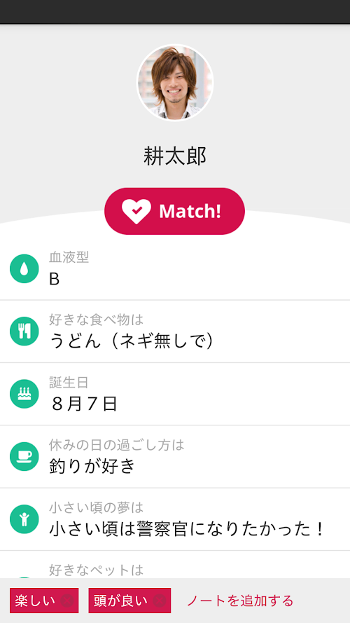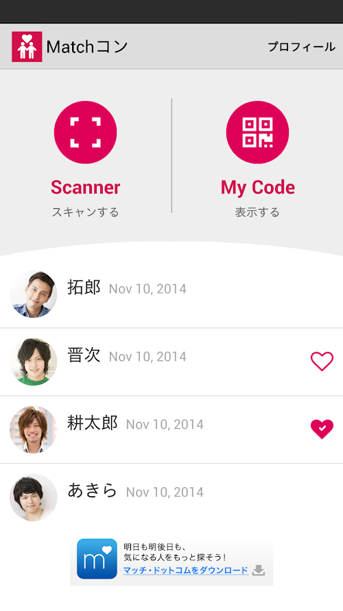 Match.comは、米国テキサス州ダラスに本社を置く、世界最大のオンラインデーティングサイトです。1995年に開始以来、恋愛・結婚マッチング業界のパイオニアとして世界40以上の国で独身男女の出会いをサポートしています。日本語サイトは2002年にスタート。24時間365日のカスタマーケア、他にはまねできない強力なマッチングアルゴリズムなど充実・安心のサービス提供で、全ての独身男女の真剣でマジメな恋活・婚活を応援しています。Town Con, matchmaking, everyone and easy information exchange that I met at a party. Self-introduction for the profile is completed in 2 minutes. You do not even need to put the addy and private information. Profile can be exchanged only with people who talk on the fly by using a QR code. In addition, "it was that story?" Is also at the party of adult number in the keyword memo function Nante without any failure. If you interested, "anxious" casually anonymous approach in button. Opponent is also you to "anxious" Match if!