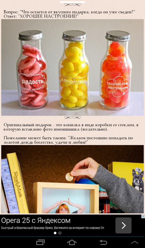 Вам хочется сделать необычный подарок для своих любимых? Хотите сделать что-то оригинальное? Тогда это приложение специально для Вас! Здесь Вы можете найти абсолютно всё! Также Вы можете подарить или устроить сюрприз не только для вторых половинок, но и также своим друзьям и просто близким и дорогим людям!You want to make an unusual gift for your loved ones? Want to do something original? Then this is the app for you! Here you can find absolutely everything! You can give or arrange a surprise not only for the second halves, but also their friends and just near and dear people!