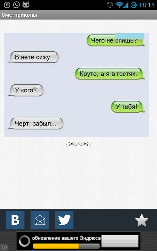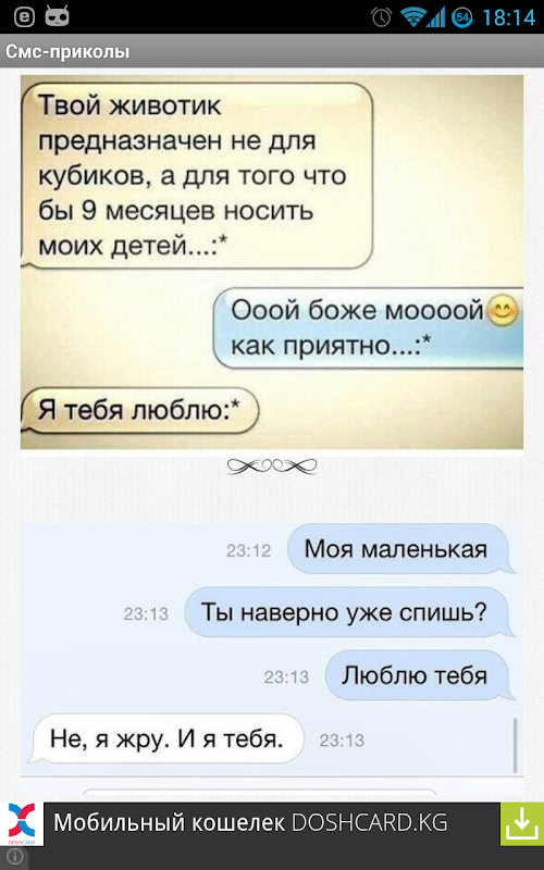 В наше время на просторах интернета мы очень часто наблюдаем различные весёлые картинки, среди которых также есть и приколы, взятые из СМС переписок! Наше приложение содержит самые смешные и интересные СМС приколы, которые обязательно зарядят Вас положительной энергией на весь день! :)In our time on the Internet, we often observe various funny pictures, among which there are also fun, taken from SMS correspondences! Our application contains the most interesting and funny sms jokes that are sure to charge you with positive energy for the whole day! :)