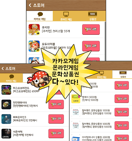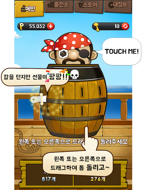 보드게임인 해적칼 꽂기게임 방식으로 통나무를 돌려 칼을 꽂고 획득한 열쇠로 다양한 아이템을 교환할 수 있는 리워드앱입니다.