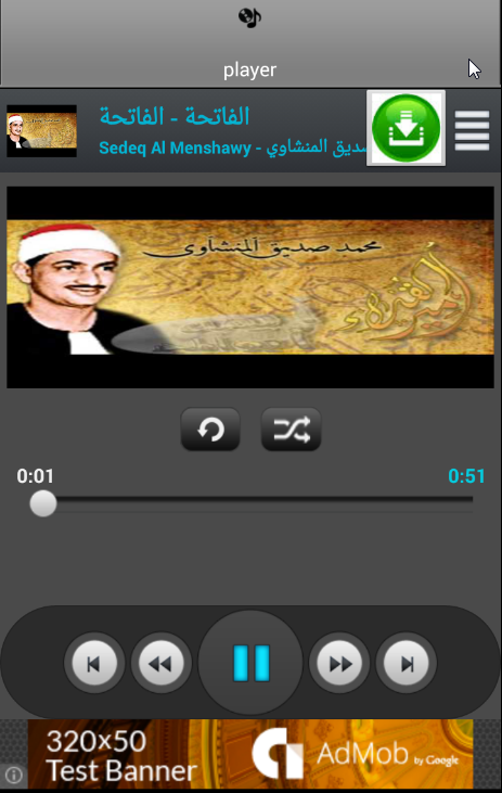 بالاضافة للتكرار والاستماع والتنقل العشوائي وميزات تصميمة وتقنية اخرى تحافظ"This application is ongoing charity