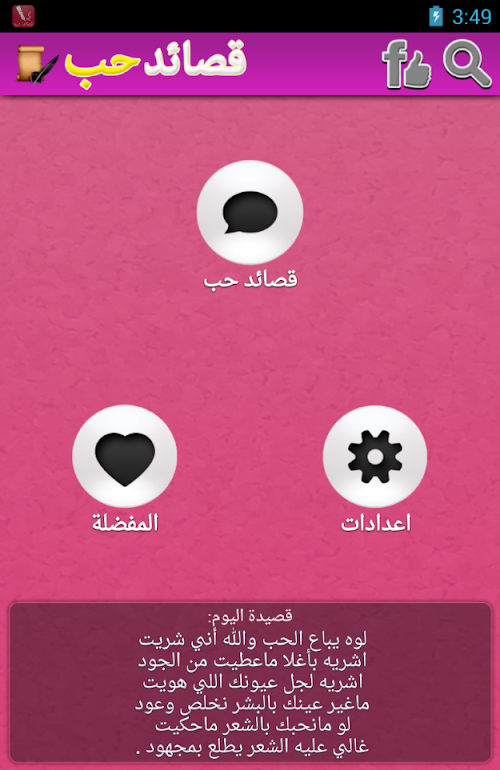 تطبيق قصائد حب هو عبارة عن برنامج يحتوي على العديد من القصائد الشعرية الخاصة بالحب يمكنك استخدامها لمراسلة من تحب او لتأخذ الالهام من خلالها.