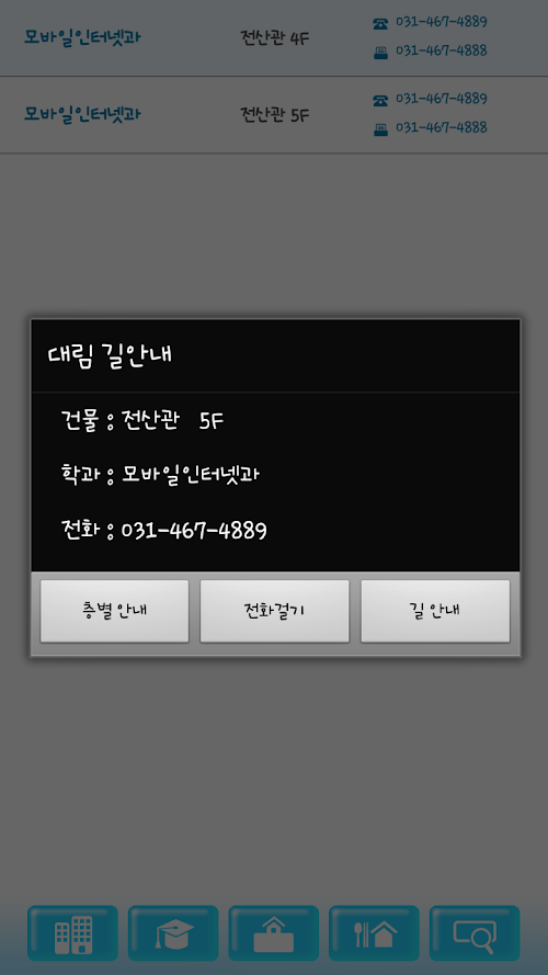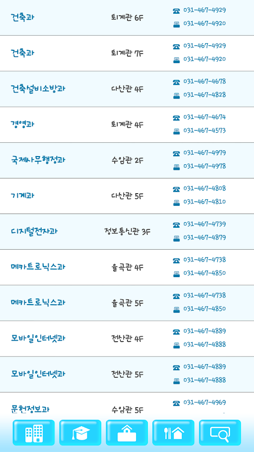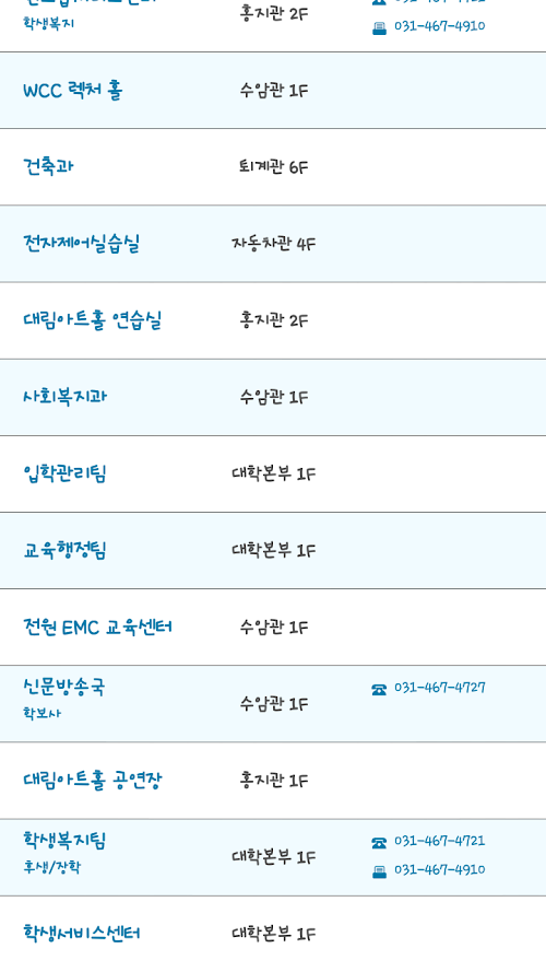 - 학과사무실, 행정부서 등 학교 내에 있는 전화번호를 제공하여 주며