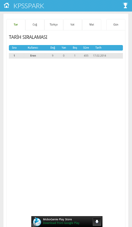 Her ders için ilk 10 sıralama görüntülenir. Sıralama doğru, yanlış ve boş bıraktığınız sorulara göre belirlenir. Aynı doğru, yanlış ve boş sayılarına sahip olan kullanıcılar arasından soruları en kısa sürede çözen kişiler daha üst sıralara yerleşir.