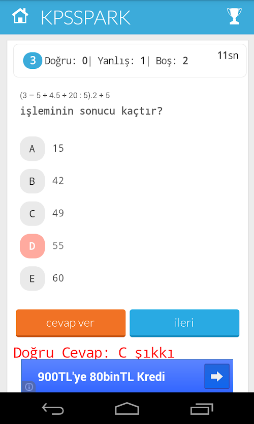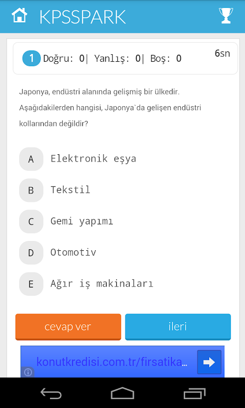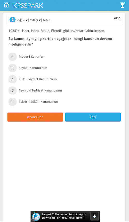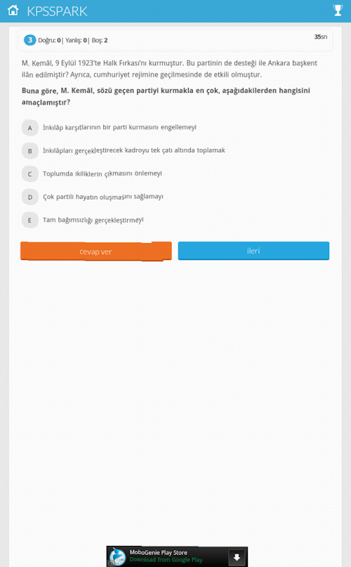 Soruların şıklarını işaretledikten sonra "Cevap Ver" butonuna tıklayarak soruyla ilgili doğru, yanlış yada boş bırakma durumunuzu görebileceksiniz ve cevabınız kaydedilecektir. Farklı bir soruya geçmek için ise "İleri" butonuna tıklamanız gerekmektedir. İleri butonuna tıklamanız durumunda soruyu boş bıraktığınız sayılacaktır.