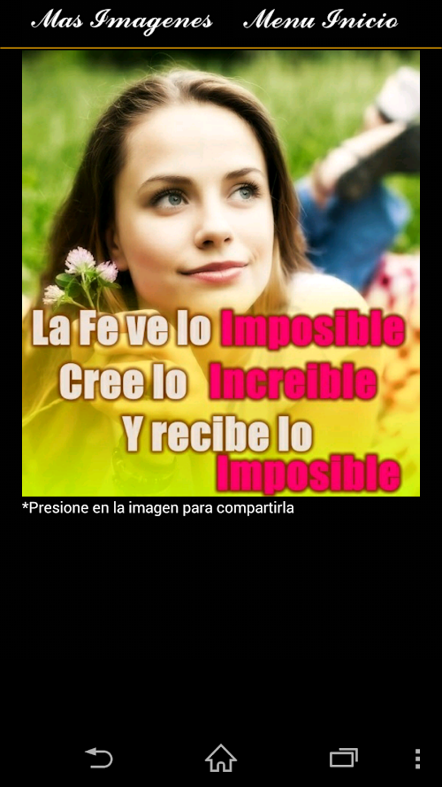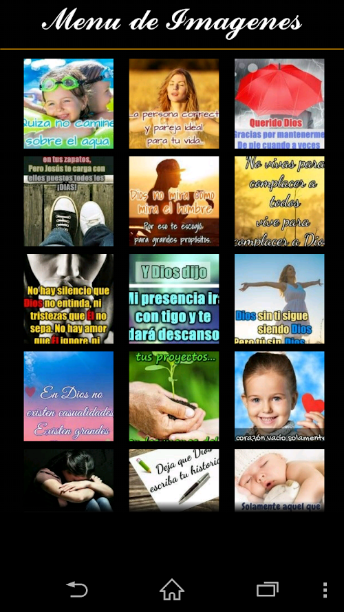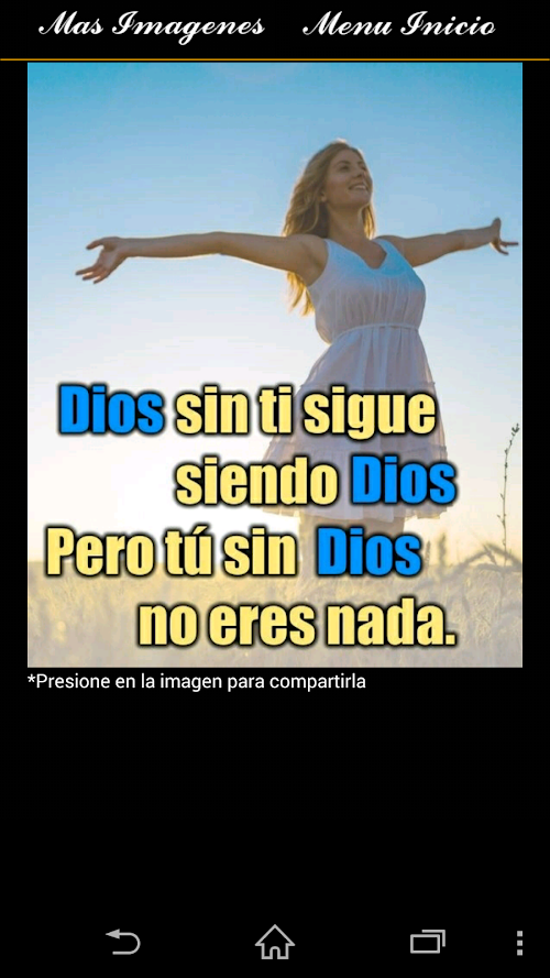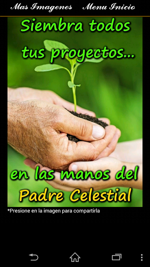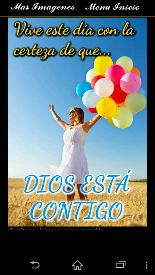 Por esta razón, ésta es una simpática colección de imágenes cristianas que te ayudarán tanto en tu vida personal y diaria, así como un herramienta para hacer feliz a todos tus seres queridos, amigos y familiares, ya que con solo tocar cada imagen podrás compartirla mediante Whatsapp o Facebook u otros medios que dispongas en tu dispositivo. In this application you will find several beautiful images with Christians and positive to cheer, motivate and surprise someone every day messages.