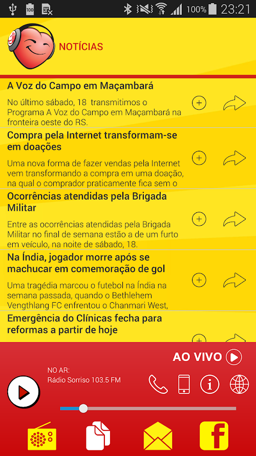 Gostou do app ? Curta nossa página https://www.facebook.com/devmobsolutionSmile FM Radio features an eclectic program, community, participatory, informative, regional popular music, MPB, gaucho traditionalist. Hits of yesterday and today's national and international. News and information. Weekend cultural programs, including programs trilingual (Portuguese, German and Italian) due to predominance of these ethnicities.