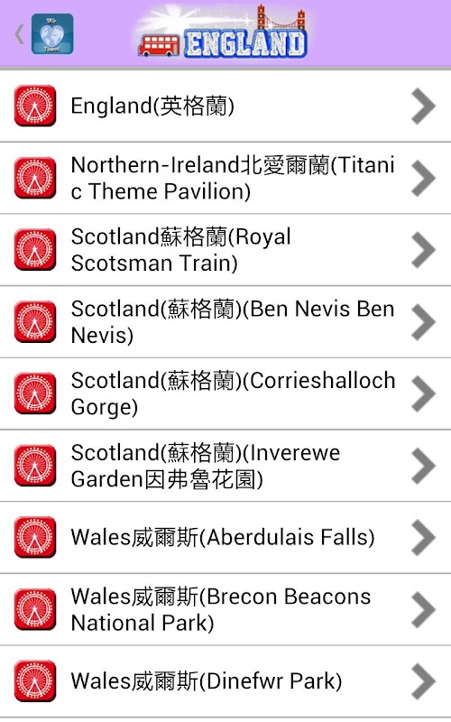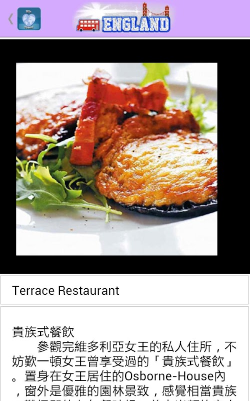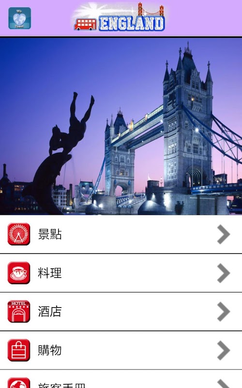 搜集了當地的特色景點﹑酒店﹑美食﹑購物﹑旅客手冊,英國各種知識應有盡有,並且提供相關地圖實景照片,幫助用家認識英國,方便用家能輕鬆渡過假期。你想在假日裏悠閒地渡過,還是想盡情地玩樂﹑享受各種美食,那英國遊將成為你的選擇。英國的大笨鐘﹑塔橋﹑倫敦眼等,英國的古今建築風格,更成為當地的著名建築,哥德式及維多利亞式的建築風格,突出英國的美。