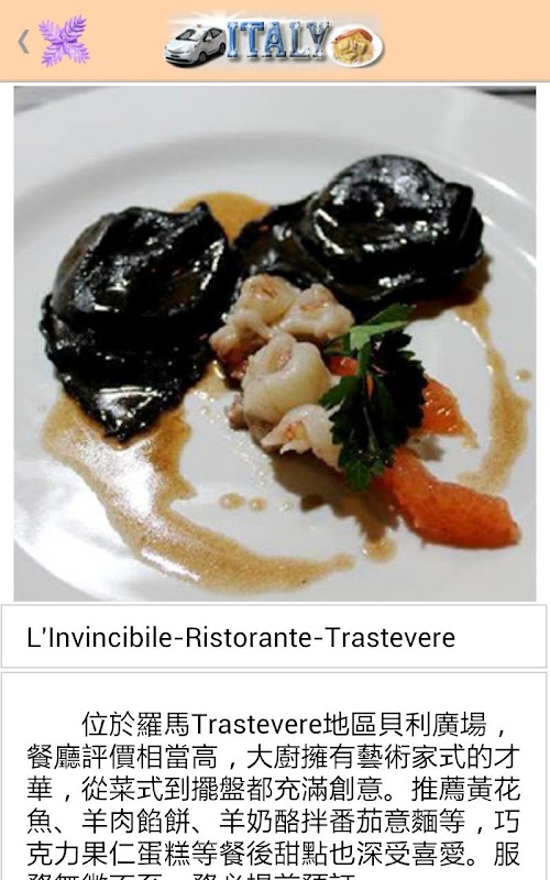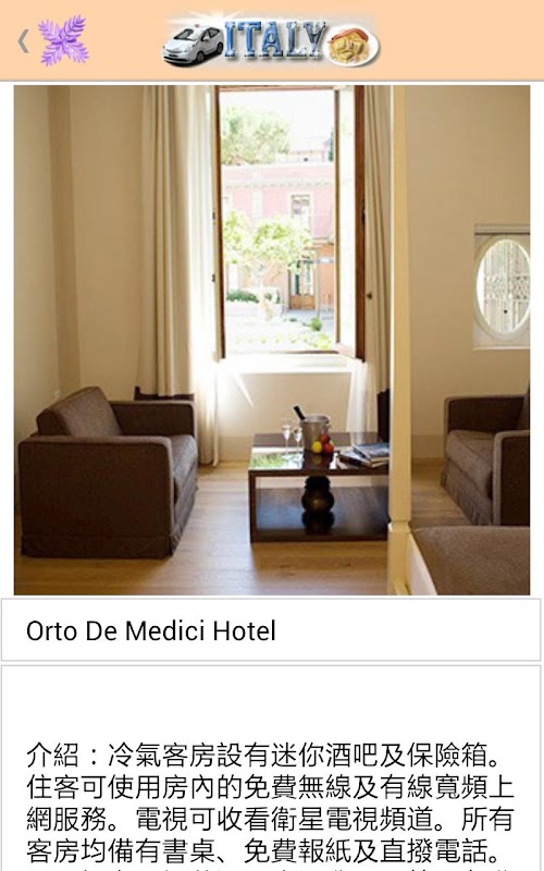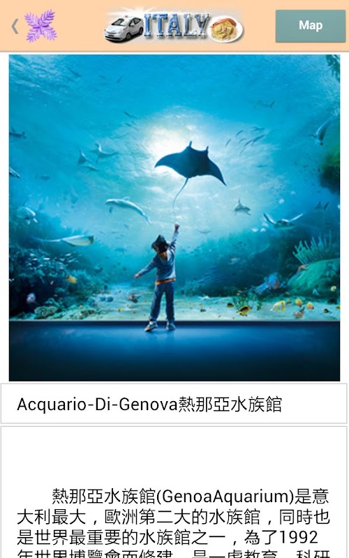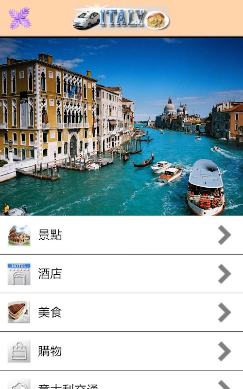 搜集了當地的特色景點﹑酒店﹑美食﹑購物﹑意大利交通,意大利各種知識應有盡有,並且提供相關地圖實景照片,幫助用家認識意大利,方便用家能輕鬆渡過假期。你想在假日裏悠閒地渡過,還是想盡情地玩樂﹑享受各種美食,那意大利遊將成為你的選擇。意大利的古代建築,表現出昔日的意大利的歷史背景及宗教文化,更有被認可的世界文化遺產,非常值得想去了解意大利在當時歐洲上所擔當的角色;水城威尼斯,被稱為水上城市,出入用船代步,值得去當地遊覽。