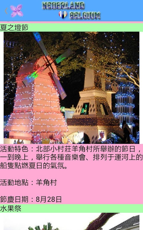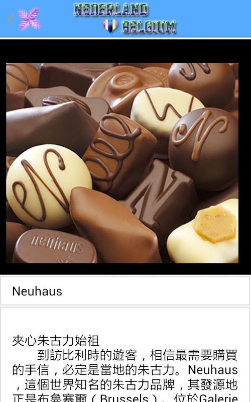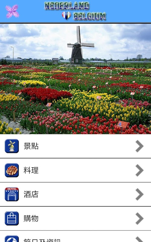 搜集了當地的特色景點﹑酒店﹑美食﹑節日﹑購物﹑交通資訊,荷蘭﹑比利時各種知識應有盡有,並且提供相關地圖實景照片,幫助用家認識荷蘭﹑比利時,方便用家能輕鬆渡過假期。你想在假日裏悠閒地渡過,還是想盡情地玩樂﹑享受各種美食,那荷蘭﹑比利時遊將成為你的選擇。荷蘭﹑比利時的古今建築風格,使當地成為旅遊景點,更有些古代建築更成為世界遺產的榮譽,可見荷蘭﹑比利時的歷史及文化都值得認識,可謂古色古香。
