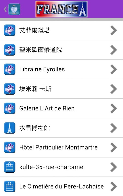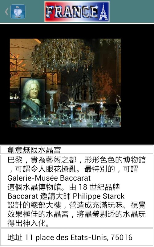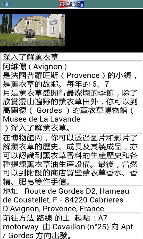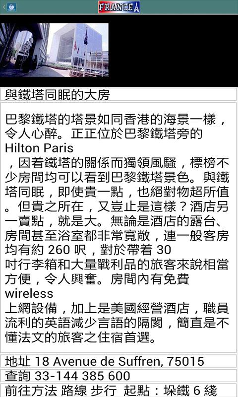 搜集了當地的特色名勝﹑酒店﹑購物﹑食店﹑交通﹑地圖﹑法國各種知識應有盡有,並且提供相關地圖實景照片,幫助用家認識 法國,各地地址、電話、營業時間、優惠和乘車路線全掌握!方便用家能輕鬆制定旅遊計劃。