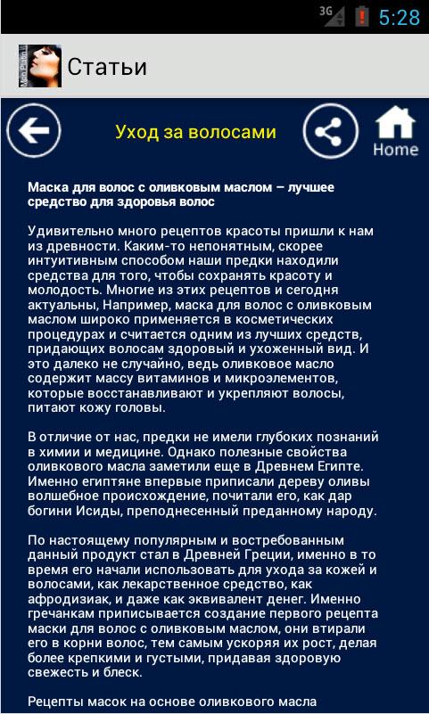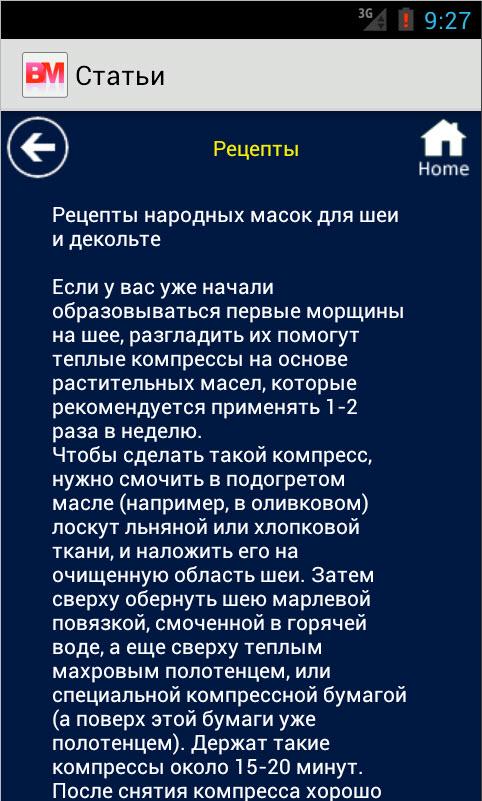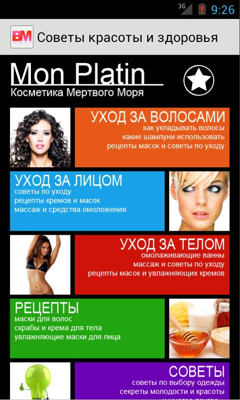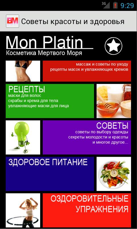 В приложении собраны наиболее популярные статьи и рецепты о том, как стать красивой и сохранить красоту, рекомендации по уходу за кожей лица, тела и волосами, простые упражнения для приобретения и поддержания физической формы, а так же рекомендации если вы решили похудеть. Как в домашних условиях изготовить маски для лица, волос, век. Все это вы найдете в данном приложении. Количество статей постоянно пополняется. Мы выбираем и добавляем только лучшие статьи. Присоединяйтесь к здоровому образу жизни. Время быть красивой!!! А косметика мертвого моря и Mon Platin помогут вам в этом.The annex contains the most popular articles and recipes on how to become beautiful and keep beauty, tips on caring for skin, body and hair, simple exercises to acquire and maintain physical fitness, as well as recommendations if you decide to lose weight. How to make home facials, hair, eyelids. All of this can be found in the appendix. The number of articles is constantly updated. We choose only the best and add articles. Join a healthy lifestyle. Time to be beautiful! A Dead Sea Mon Platin help you with this.