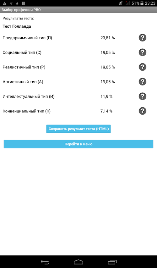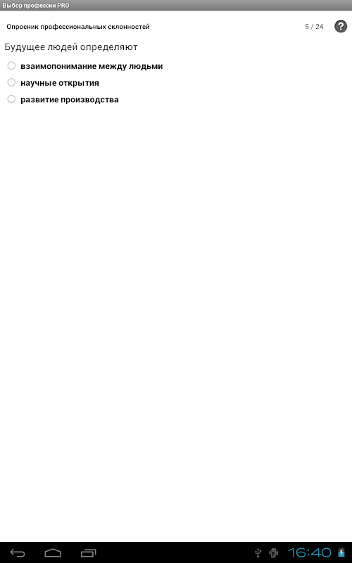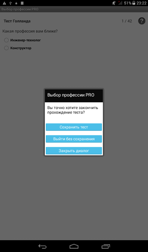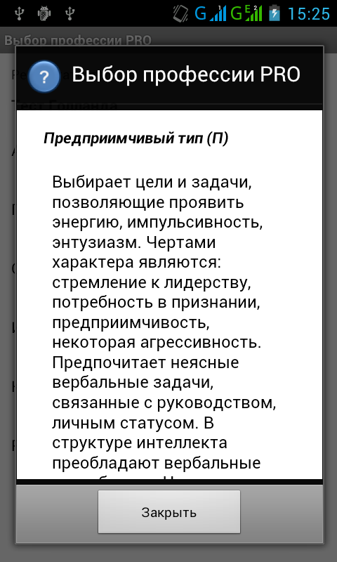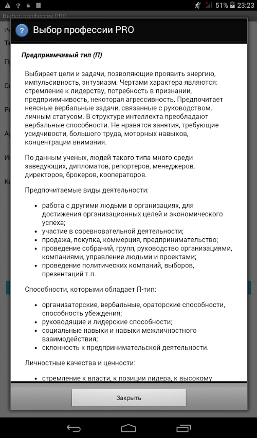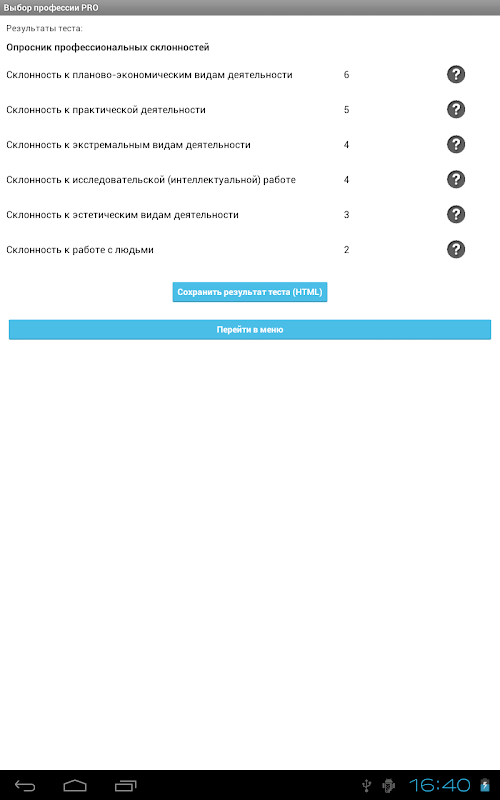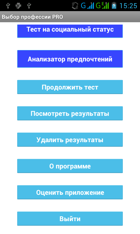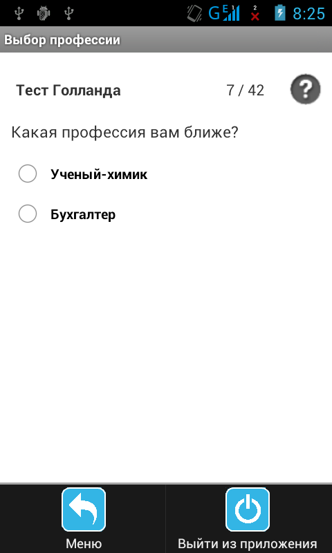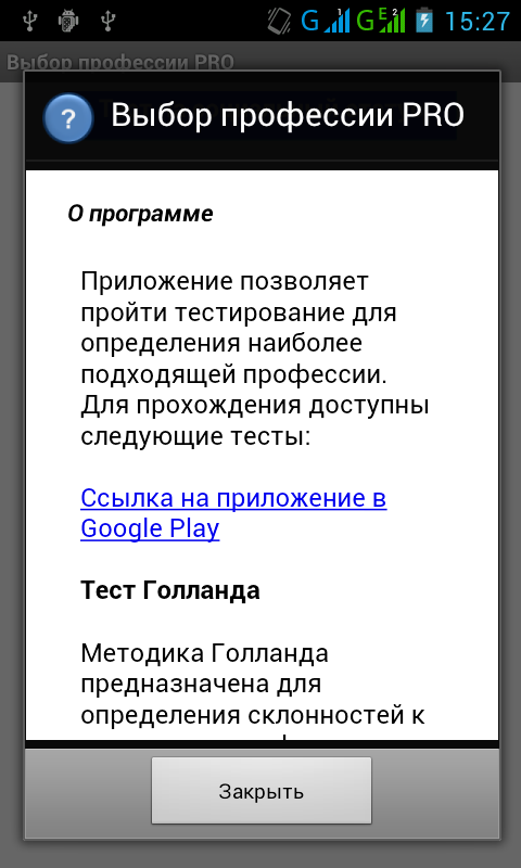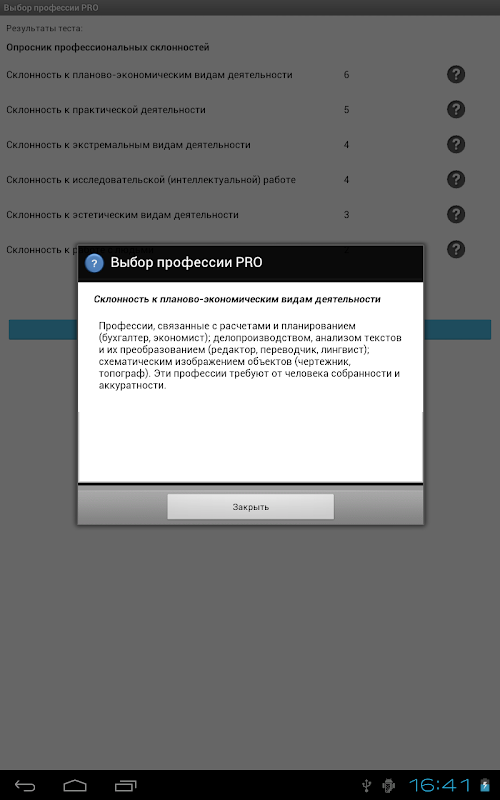2. В случае возникновения ошибок убедительная просьба писать на почтовый ящик с целью их скорейшего устранения.If you find it hard to choose a profession, or do not know where it is better to do, where to continue their education, then you can use the application "The choice of profession," which contains a set of tests to determine the appropriate profession and career counseling.